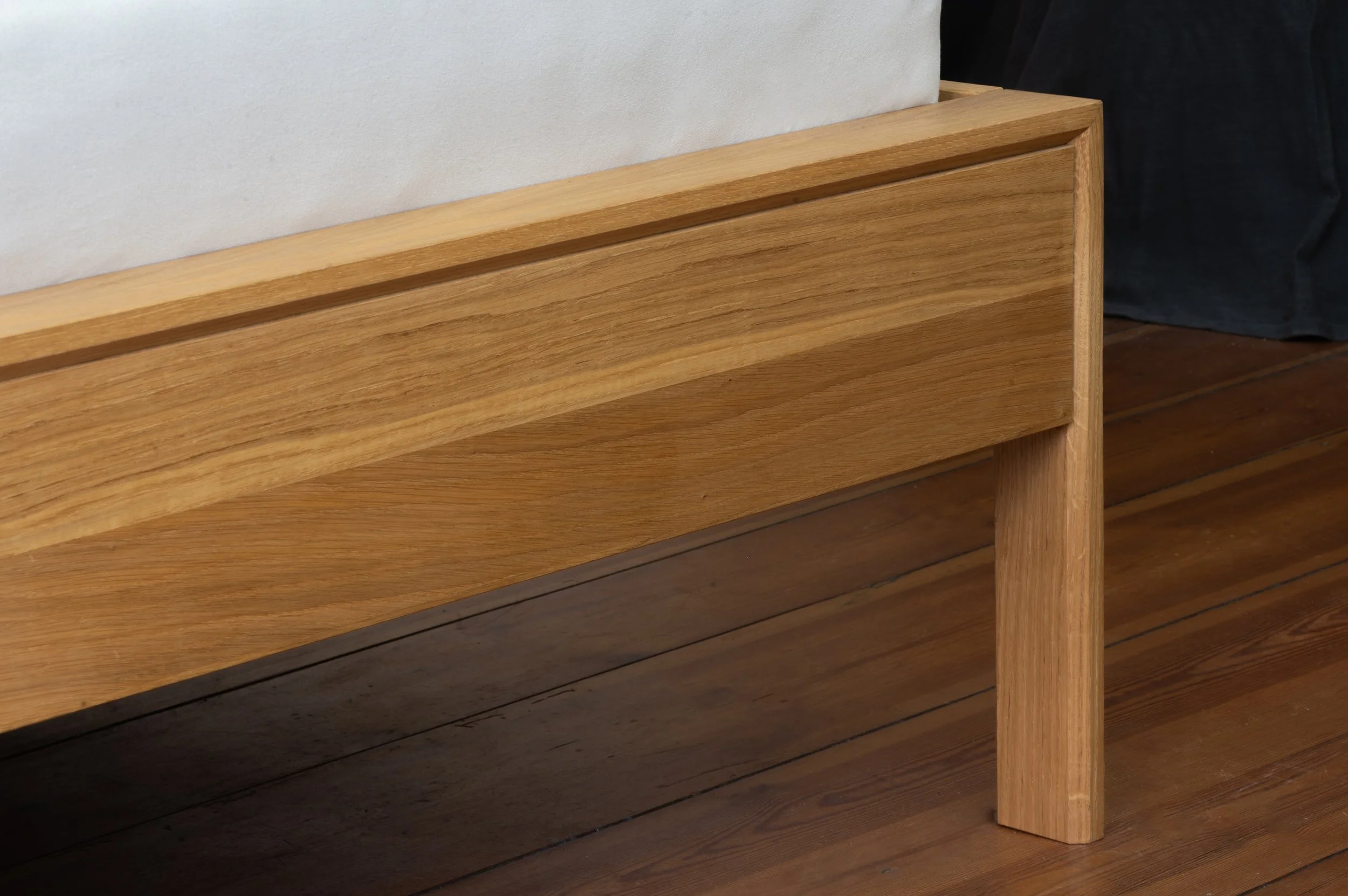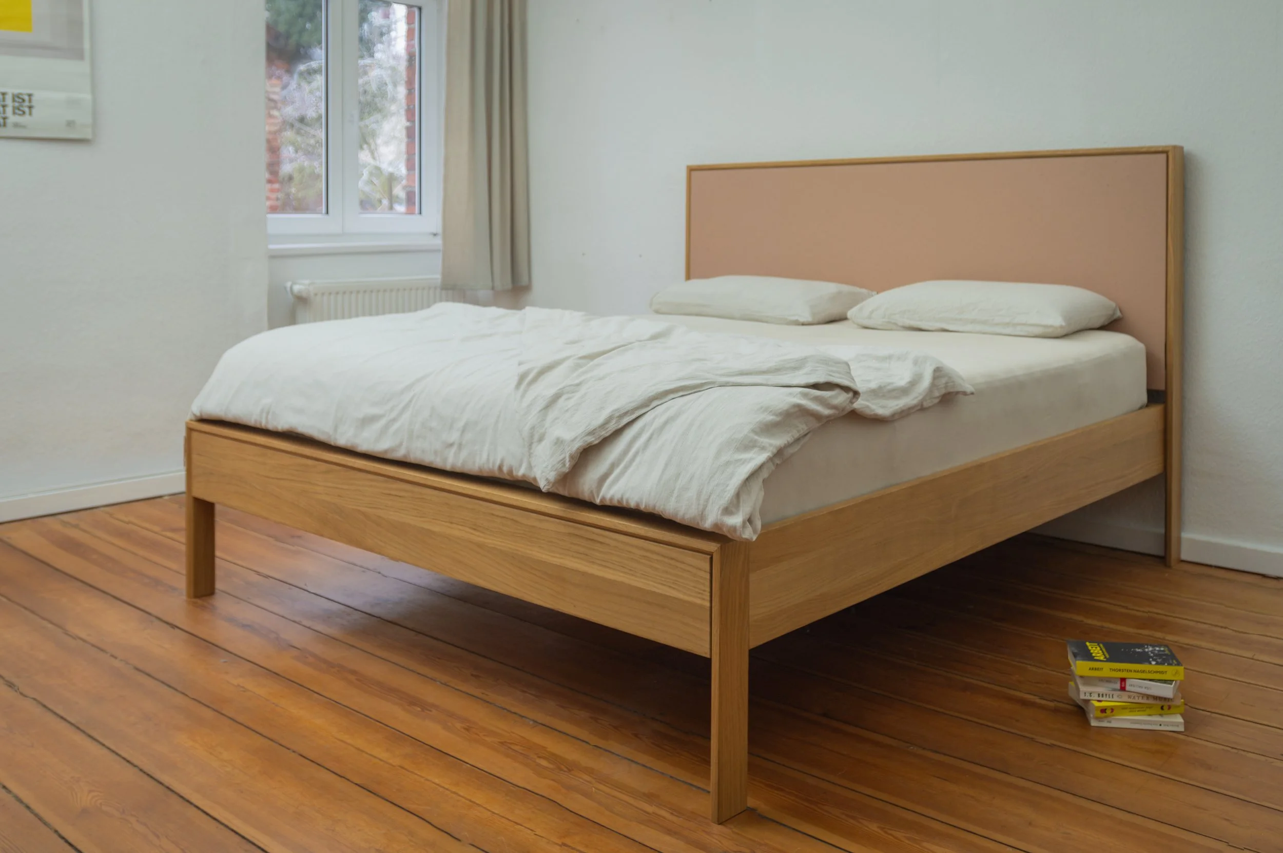 Ein stabiles Bett, das aufgrund von Scheulenburg-Verbindern leicht zerlegbar ist. Die beiden aufrechten Rahmenteile wurden an den Ecken auf Gehrung gefertigt. Für die Füllung des Kopfteils wurde Linoleum gewählt.