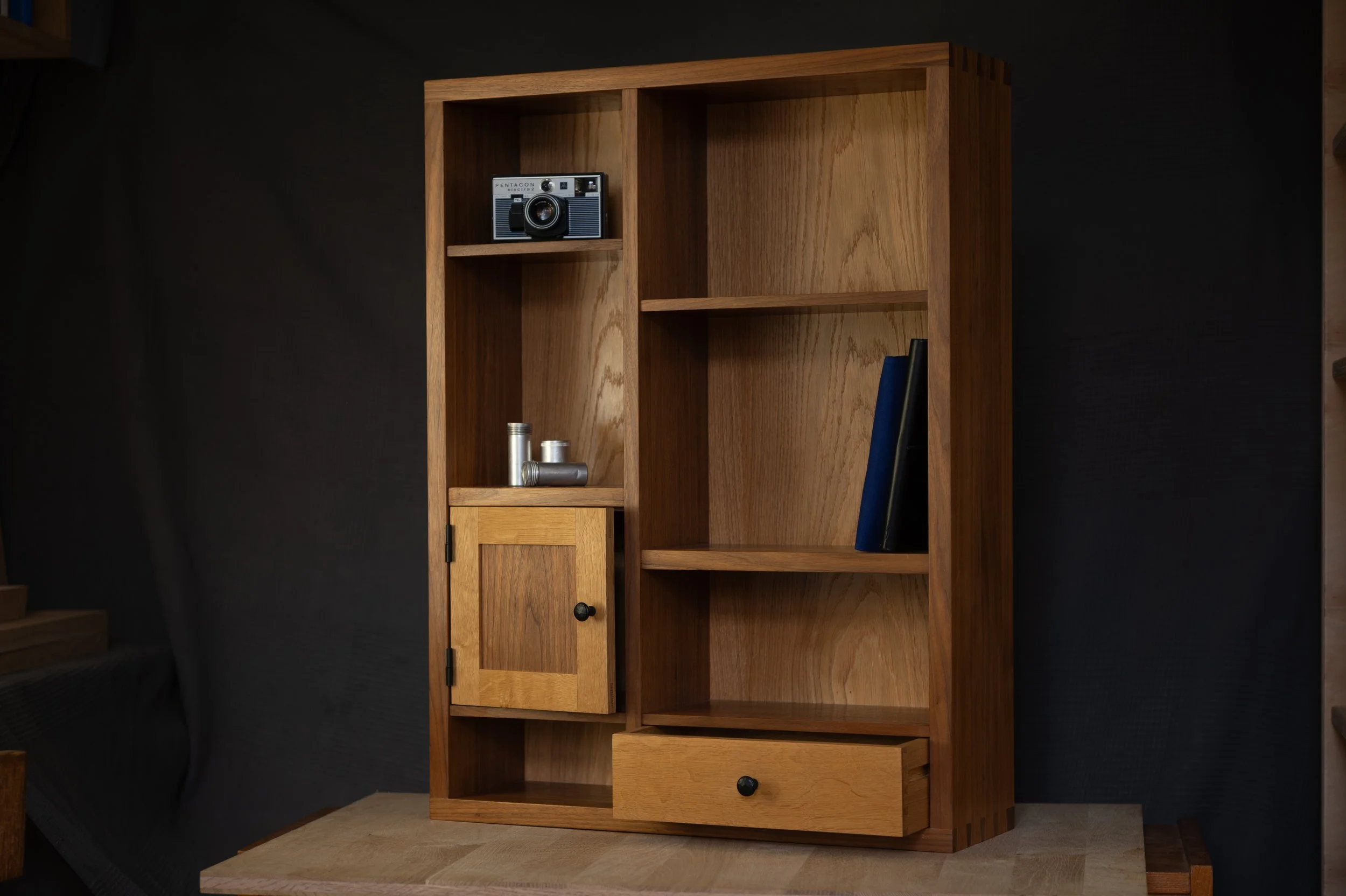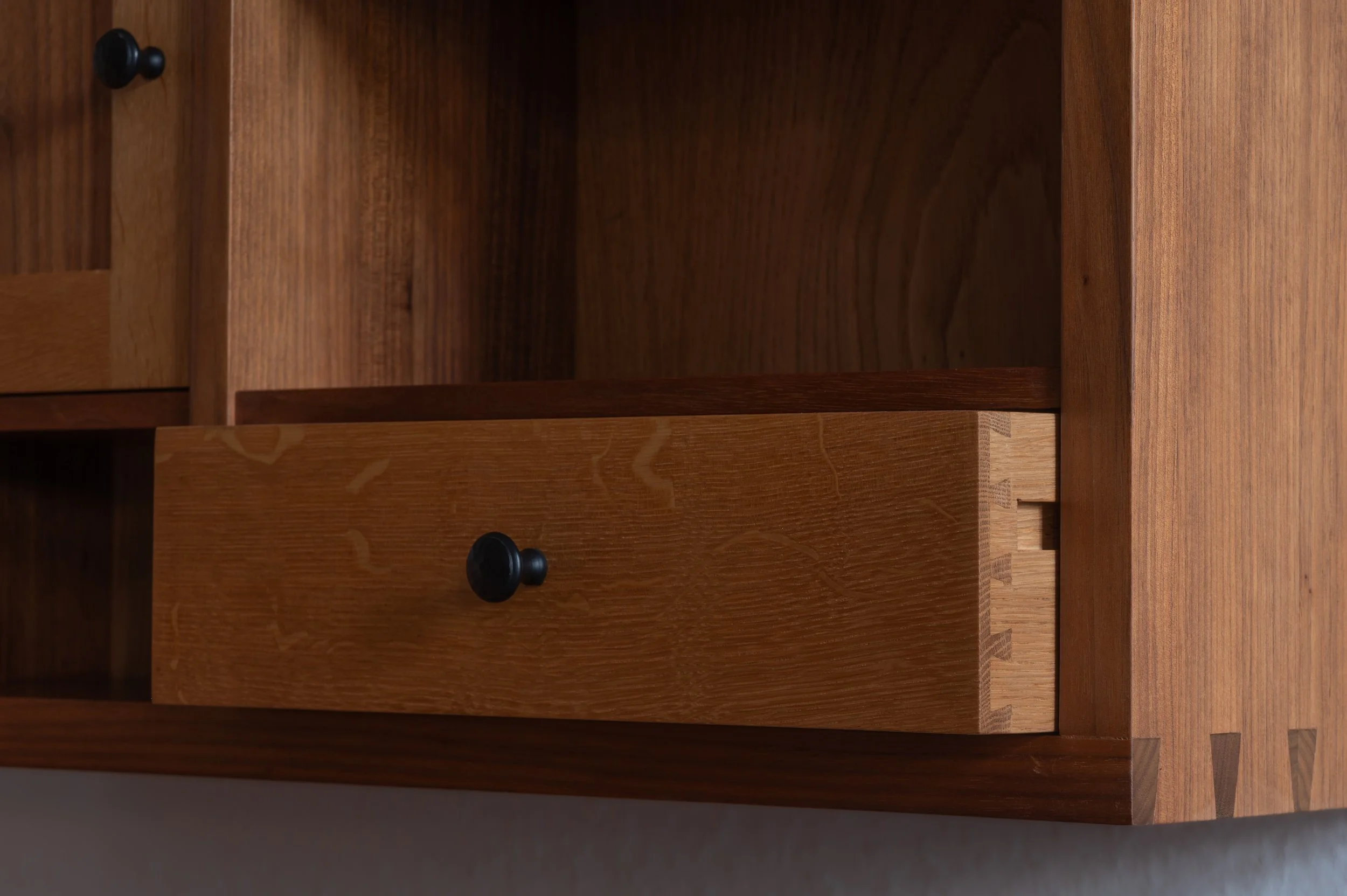 Inspiriert von “Michael Pekovich” wurde dieses kleine Schränkchen in klassischer Brettbauweise gefertigt. Die Korpus-Eckverbindungen sind von Hand gezinkt. Das Türchen besteht aus einem Rahmen mit Schlitz-Zapfen-Verbindung und einer Vollholz-Füllung. Der Schubkasten wurde ebenfalls mit Schwalbenschwanzverbindungen versehen und ist über eingenutete Leisten hängend geführt. Die Wandaufhängung wurde über eine Keilleiste gelöst.