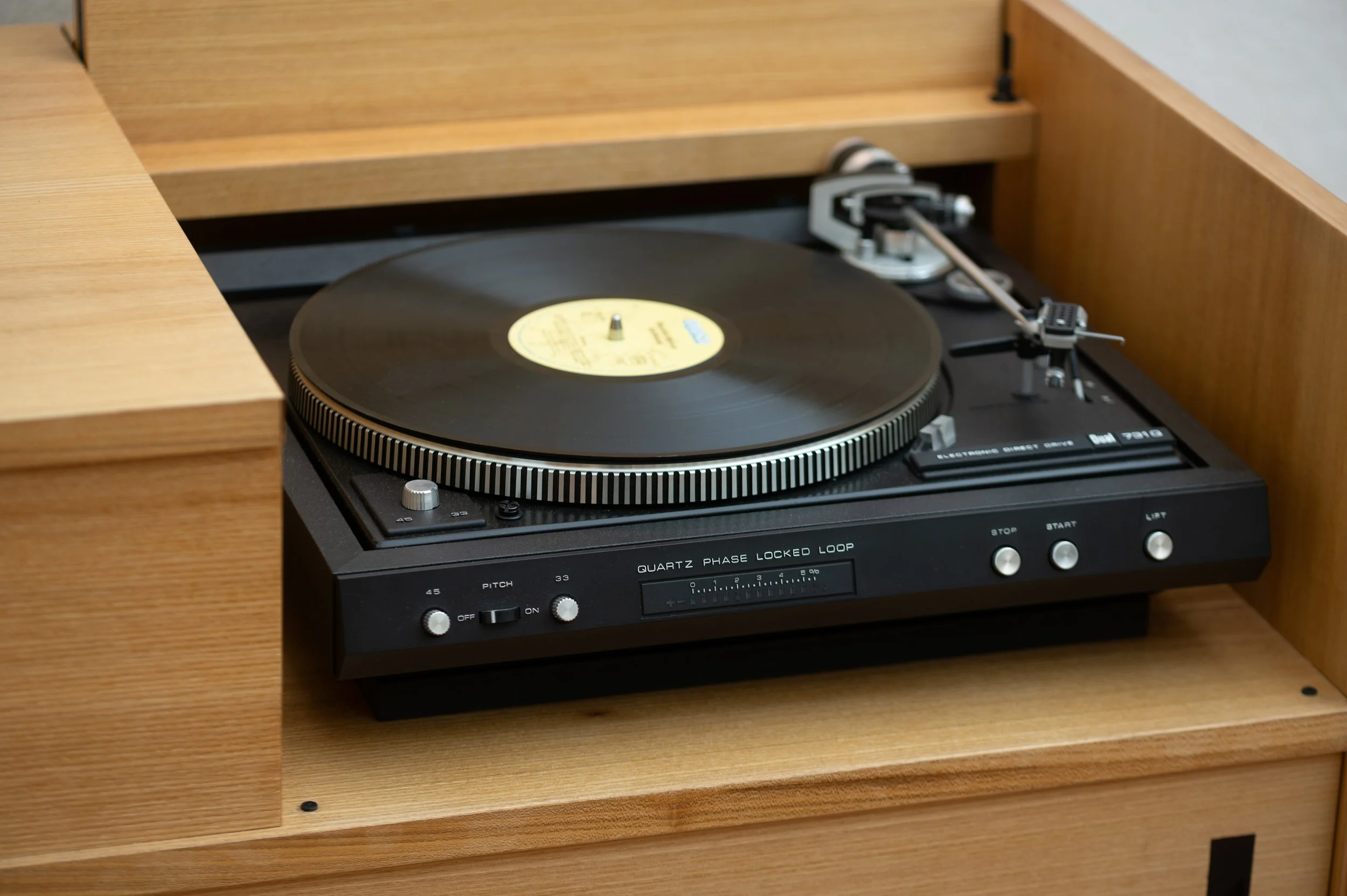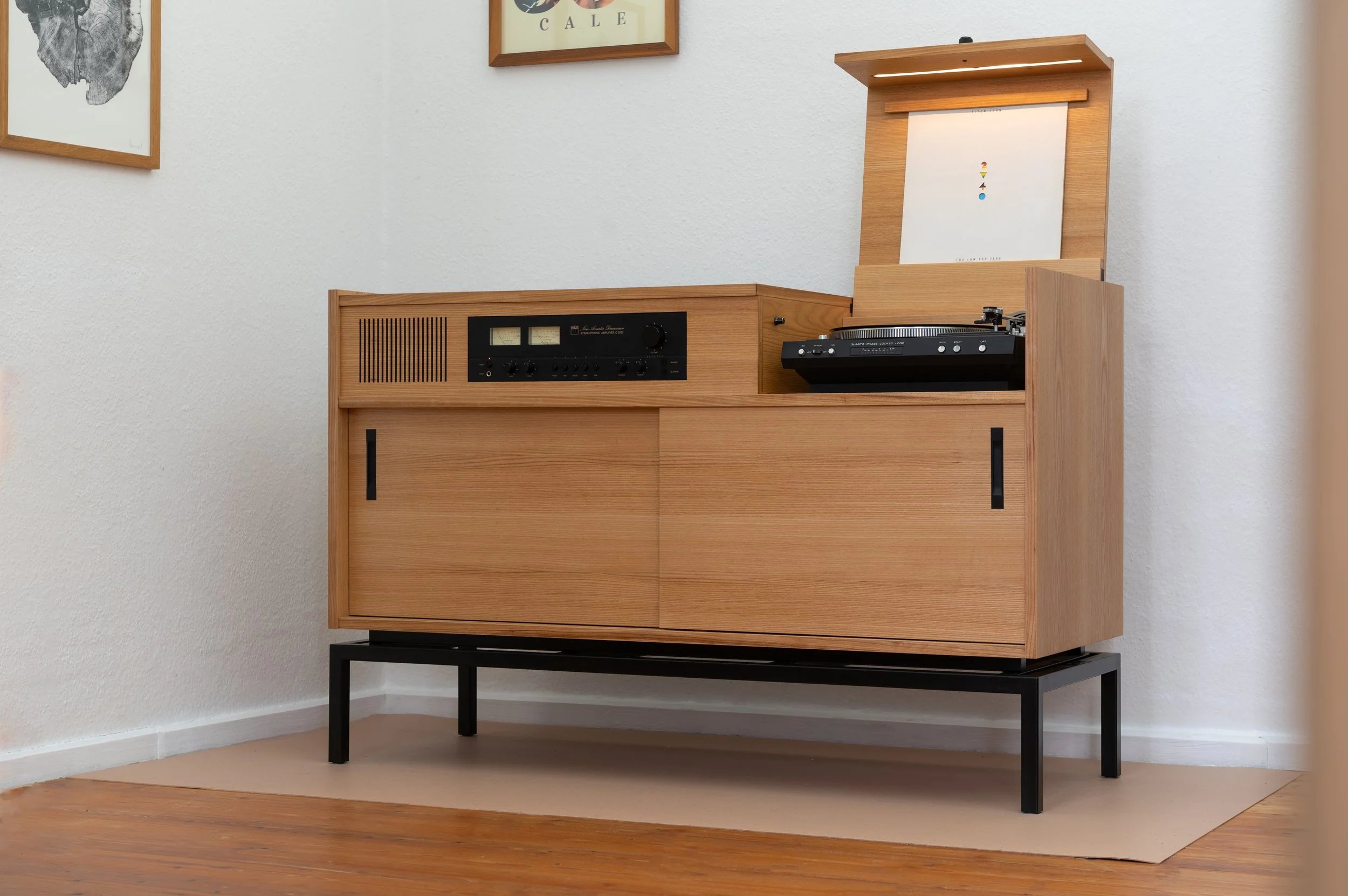 Ein DUAL-Plattenspieler ist unter einer innovativen Klappe verborgen, die durch eigens entwickelte Beschläge aus Rotationsdämpfern und 3D-gedruckten Bauteilen gehalten wird. Bei geöffneter Klappe sorgt ein LED-Streifen für stimmungsvolles Licht, das sich per Drehschalter dimmen lässt.