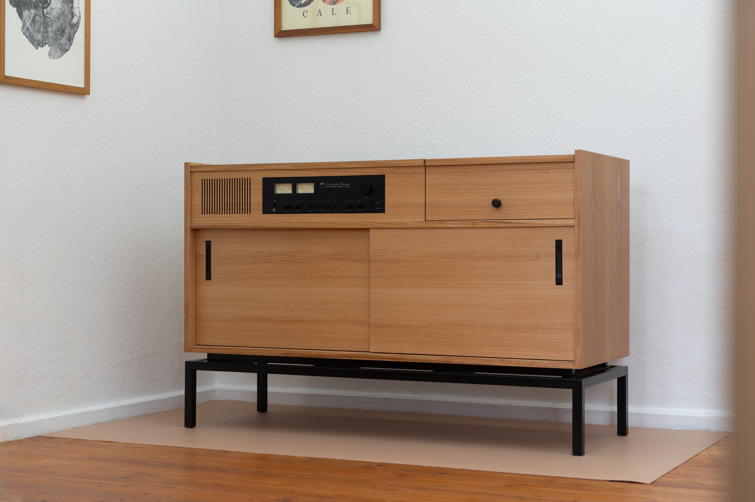 Ein NAD-C3050 Verstärker ist nahtlos in die Frontblende integriert. Zwei leichtgängige Schiebetüren laufen auf japanischen Rollenführungen. Sie bieten Zugang zu drei handgezinkten Schubkästen aus Ahorn auf der linken Seite. Der obere ist abschließbar und wird mit einem Kulissenauszug geführt. Auf der rechten Seite befindet sich eine weitere Schublade, die Platz für ca. 80 Schallplatten bietet.