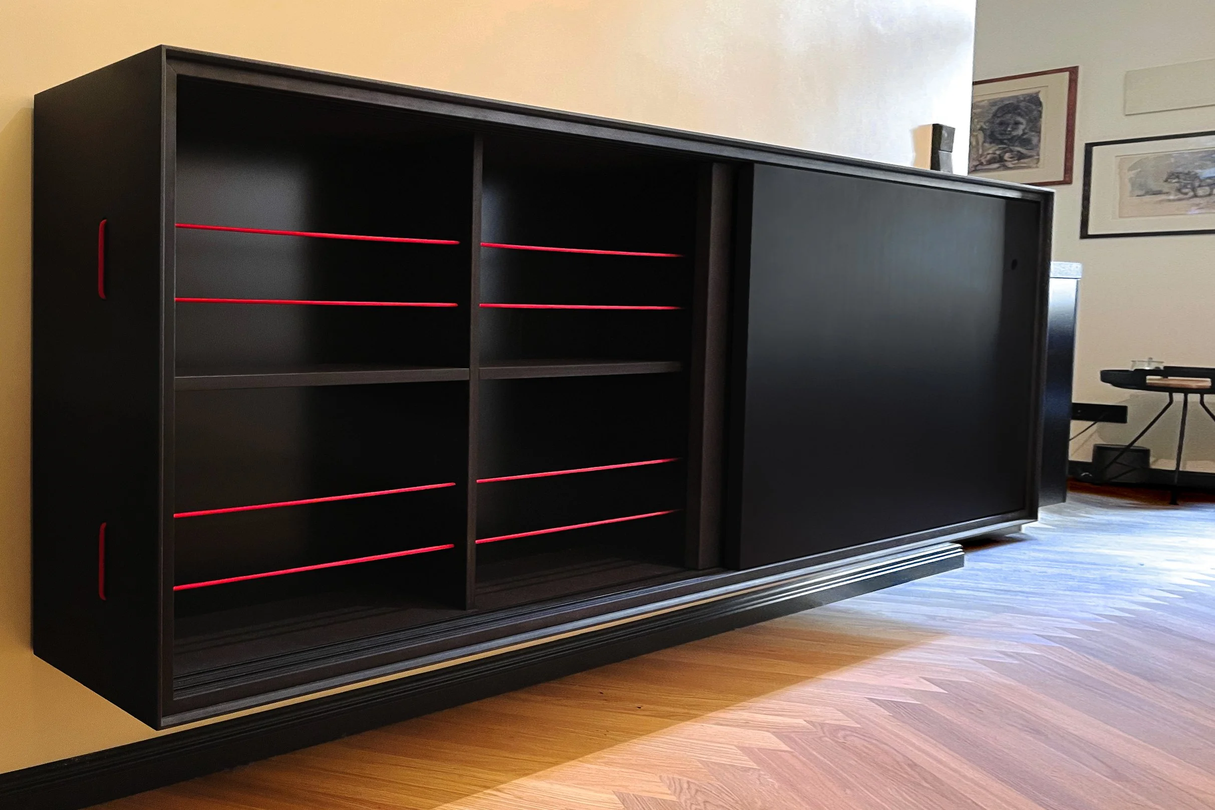Highlight dieses schwebenden Schuhregals sind die roten Elastikbänder, welche sichtbar durch die Seiten des Korpus gefädelt wurden und an Schuhbänder erinnern. Aufgrund der zwei großen Schiebetüren wird im geschlossenen Zustand eine ruhige und aufgeräumte Optik erzieht.