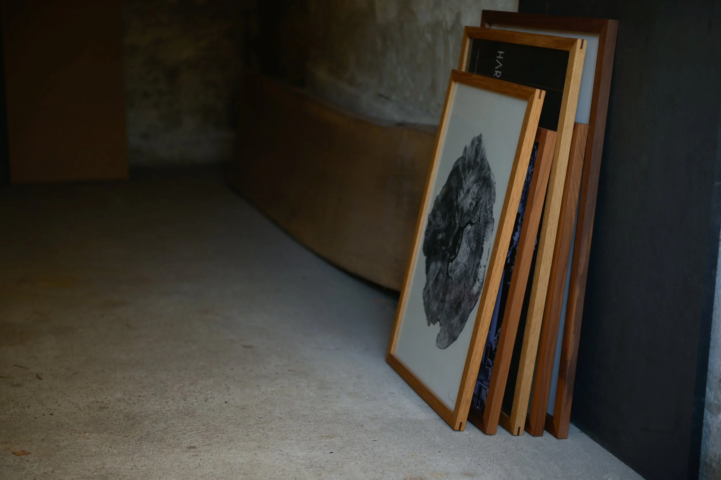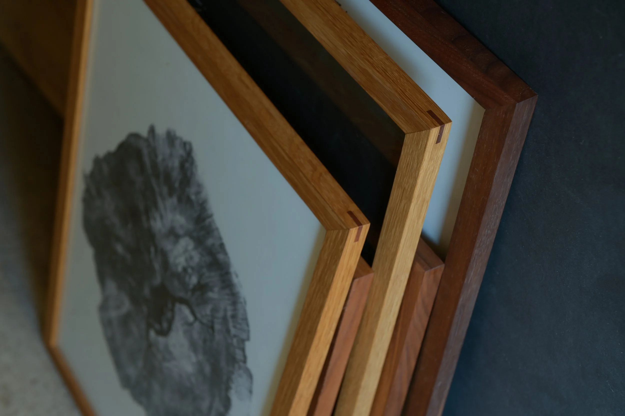 Einige Bilderrahmen aus Abschnitten unterschiedlicher Hölzer. Die Fremdfeder an den Eckverbindungen verbindet Funktion und gestalterische Aspekte gleichermaßen.